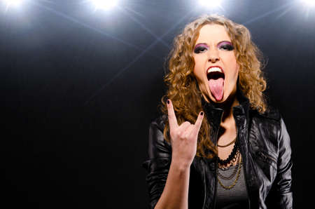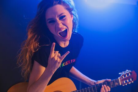 Image of emotional amazing young positive woman musician play on a guitar on scene in night club over dark background with flash lights showing rock gesture.