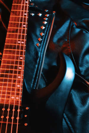 Black electric guitar lies on a leather jacket