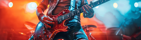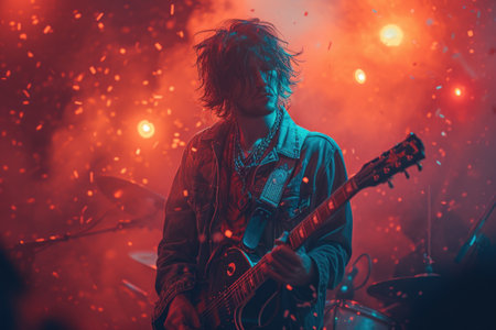 Musician passionately playing electric guitar during a live concert, illuminated by vibrant stage lights