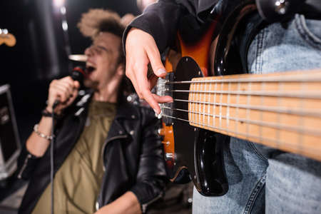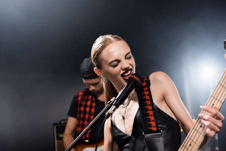 KYIV, UKRAINE - AUGUST 25, 2020: Close up view of woman playing electric guitar near vocalist shouting in microphone on blurred background