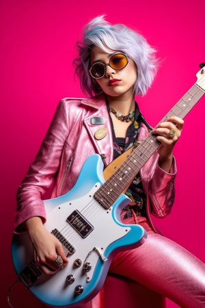 A woman with sunglasses and a guitar playing in front of smoke, AI