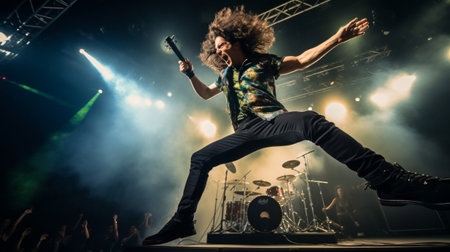 Rebellious rock singer mid-jump during performance