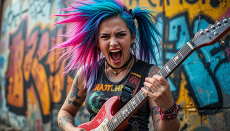 Rebel Spirit: Punk Rock Woman Screaming and Playing Electric Guitar in Front of a Colorful Graffiti Wall
