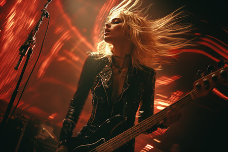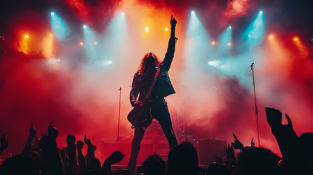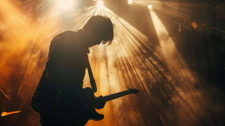 A rockstar guitarist ignites the stage with electrifying energy, bathed in vibrant lights His passionate performance captivates the crowd, as his powerful riffs and stage presence deliver a thrilling live music experience AI Generative