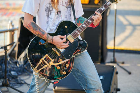 Svetlogorsk, Russia - 08.15.2021 - Rock musician playing guitar at outdoor heavy metal festival. Electric guitar in hands of guitarist at grunge concert, close up, hard rock group performance