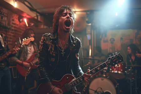 Rock guitarist expressing power and freedom on dark stage with intense emotion. Concept of music psychology, emotional liberation, creativity, and editorial promotion.