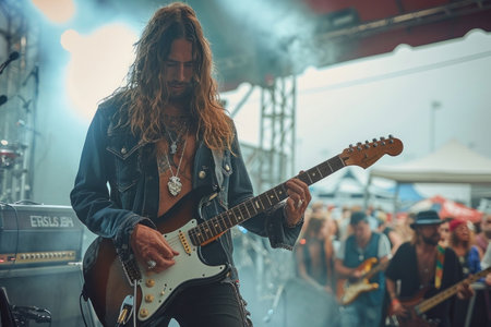 Talented long-haired male musician in a denim jacket and black shirt passionately plays guitar on stage at a lively outdoor music festival.