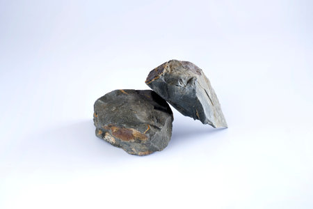 This image showcases a close-up of dark-colored, rough-textured stones. The composition features a shallow depth of field, emphasizing the texture and details. The colors are predominantly cool tones with a moody atmosphere. Suitable for various creative and commercial applications, the image presents a natural, rugged aesthetic.