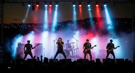 Band performing live music under vibrant stage lights, creating an electrifying atmosphere during an unforgettable concert event