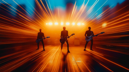 Rock band playing under intense golden stage lights, with dramatic silhouettes and energy.