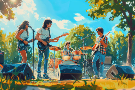 Young Band Performing Outdoors in Sunny Park - Summer Music Festival Vibes and Energetic Live Performance