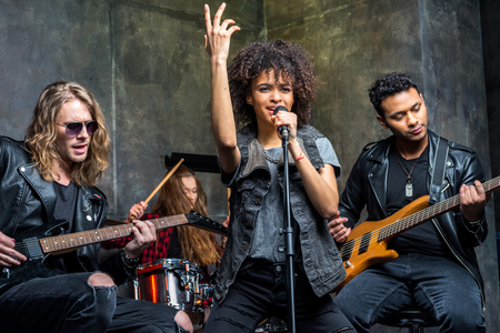 Young multiethnic rock and roll band performing hard rock music