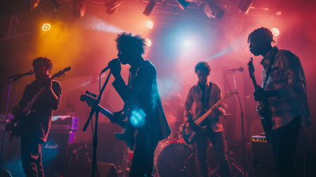 Rock band performing live on stage under dramatic lighting in a vibrant atmosphere