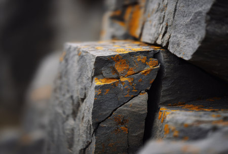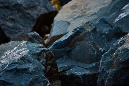This image showcases a close-up of dark-colored, rough-textured stones. The composition features a shallow depth of field, emphasizing the texture and details. The colors are predominantly cool tones with a moody atmosphere. Suitable for various creative and commercial applications, the image presents a natural, rugged aesthetic.