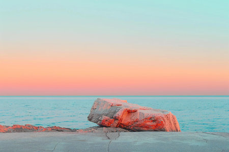 Capture the ethereal beauty of a tranquil ocean sunset as it paints the rocky seashore in soft pastel hues The calm waters, illuminated by the fading sunlight, shimmer in shades of pink and purple, creating a serene and dreamy atmosphere The majestic stones, weathered by the relentless waves, stand as silent sentinels against the fading light, adding a touch of timeless grandeur to the scene AI Generative