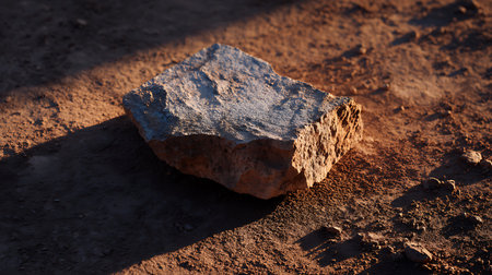 Rock on sandy surface with warm sunlight casting shadows in low angle close up view creating peaceful natural scene