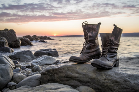 boots on a rocky beach at sunset, waves in background, created with generative ai