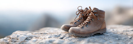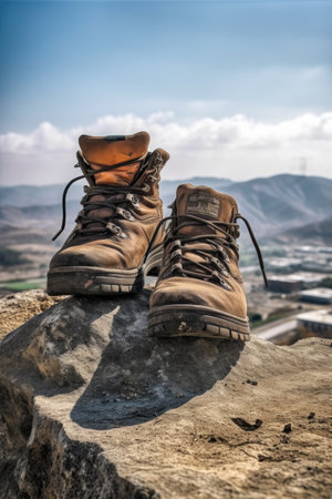 well-worn hiking boots on a rocky summit, created with generative ai