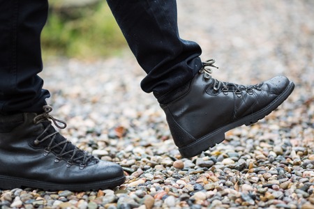 male legs and shoes top view. Selfie feet in black leather tracking shoes or boots on a pebble beach.