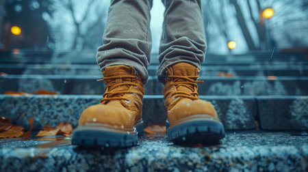 human legs in dark pants yellow boots on the pavement