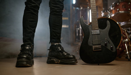 Cropped view on rocker feet legs on stage with electric guitar