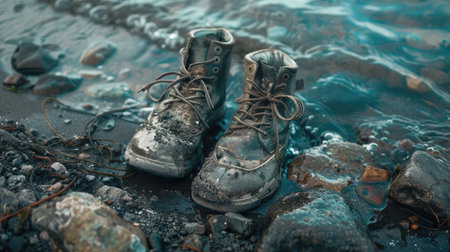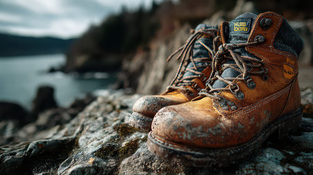 A pair of weathered hiking boots rests on a rocky shoreline beside a tranquil body of water. The rugged footwear showcases the beauty of outdoor adventure and exploration.