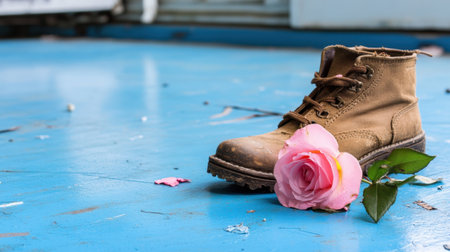 Contrast of soft rose and rough boot on electric blue floor
