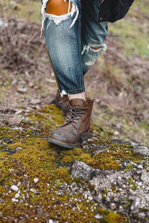 female feet in boots on the ground nature top view