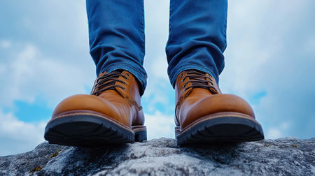 Individual stands on a rock wearing stylish brown boots, showing a sense of adventure and exploration.
