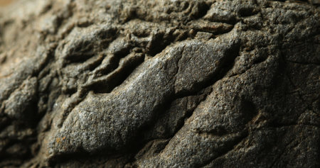 Close-up view of a dark, textured rock surface with jagged and rough texture