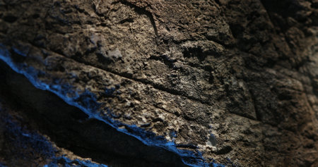 Close-up of dark rock surface with vivid blue lighting and layered texture