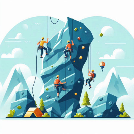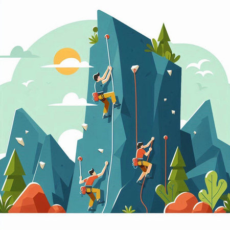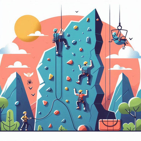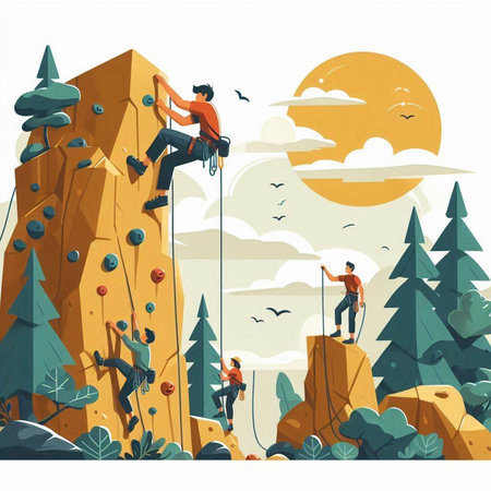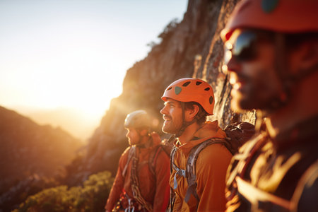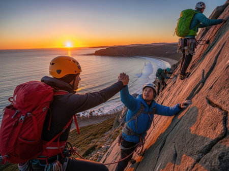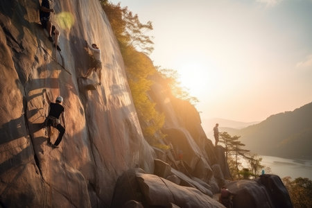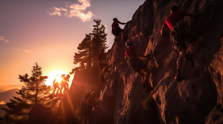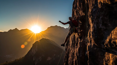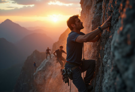 Rock climbers ascend a challenging cliff face at sunrise, surrounded by a stunning mountainous landscape. The scene reflects determination, adventure, and the beauty of nature.