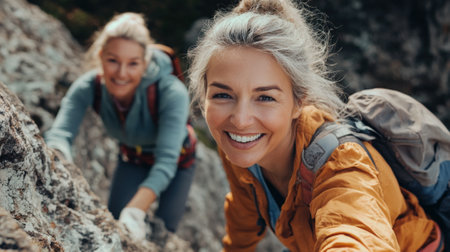 A determined group of climbers ascend a steep mountain, showcasing their strength and perseverance, Hiker pulled through a precarious crag by helpful friend, AI Generated