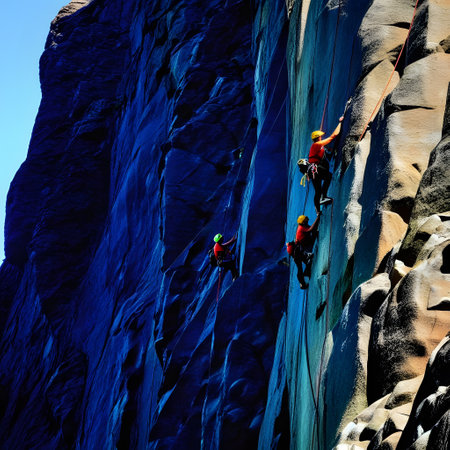 Climbers ascending a steep rock face in a desert canyon, showcasing teamwork and determination in extreme sports