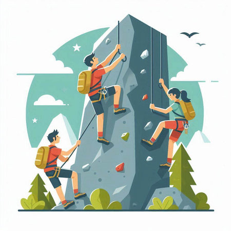 Man and woman climbing on a cliff. Flat style vector illustration.