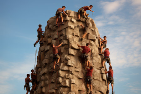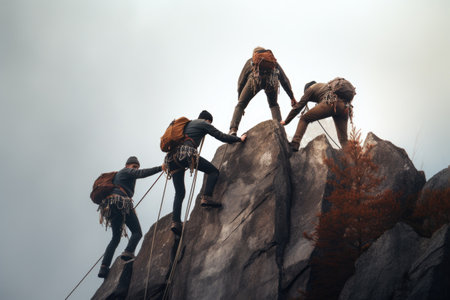 A group of men conquering adversity, hiking up a mountain generated by artificial intelligence