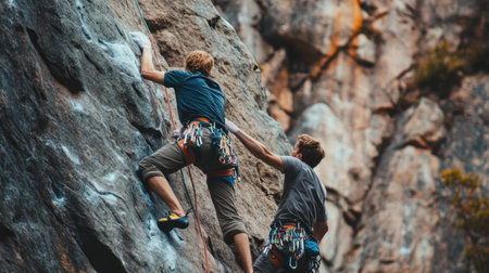 A climber helps another person up a steep rock face, symbolizing teamwork and shared success.