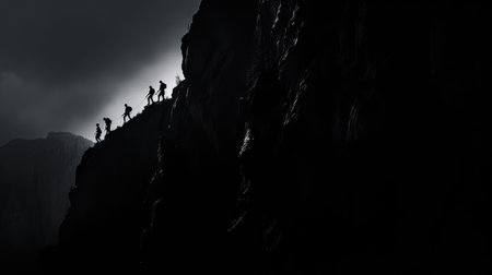 Silhouetted climbers ascending steep mountain slope during sunset with dramatic sky. Adventure and outdoor activities
