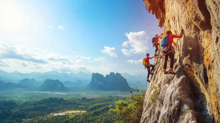 Two equipped rock climbers ascending challenging vertical rocky wall. Generative AI