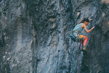 Climber overcomes challenging climbing route. A girl climbs a rock. Woman engaged in extreme sport. Extreme hobby.