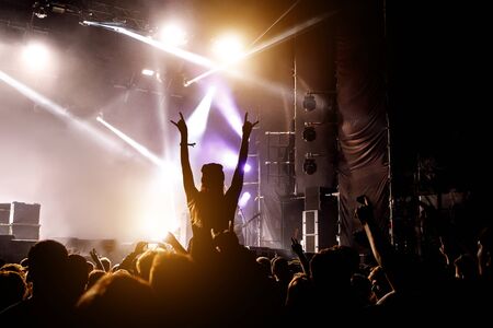 Stage lights and crowd of audience with hands raised at a music festival. Fans enjoying the party vibes.