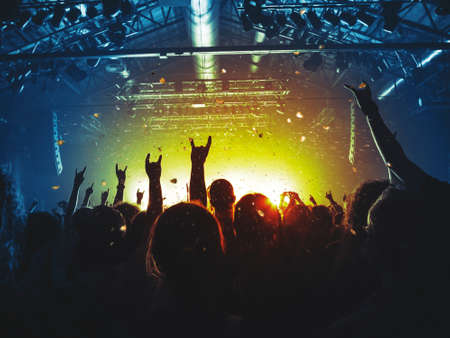 Abstract blur atmosphere: happy people enjoying outdoor music festival concert, raised up hands and clapping of pleasure, active night life concept, play of light and shadow on the huge stage