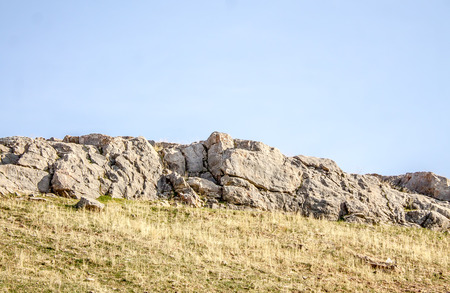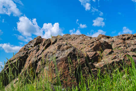 Close up of stones in highlands. Destroyed rock formations in mountainous area on sunny day.
