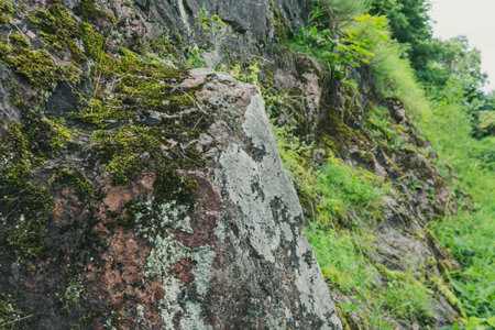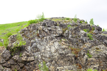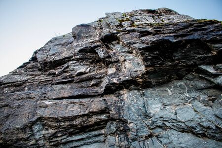 Big mountain cliff under cloudy sky close-up. Beautiful rocky gray textured background with vegetation. Majestic nature.