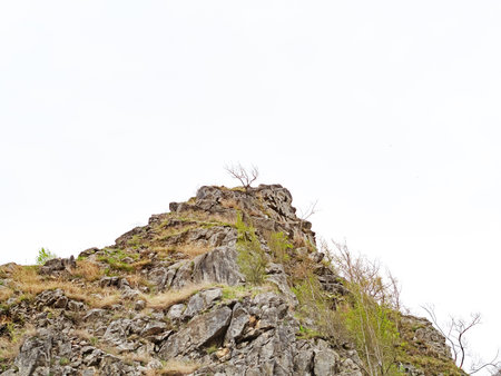 Rock mountain slope or top foreground close-up isolated on white background. Element for matte painting, copy space.