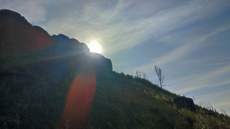 Edge of steep slope on rocky hillside. Dramatic scenery in mountain area.