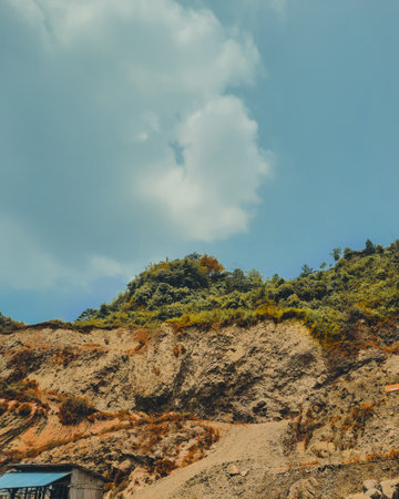 A rugged hillside with exposed rocky soil sits beneath a dense layer of green forest, creating a striking contrast between natural vegetation and eroded terrain under a clear blue