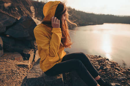 portrait of a young beautiful woman on the seashore against the background of rocks