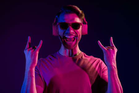 Portrait of attractive cheerful guy listening bass sound showing horn sing having fun isolated over dark neon light violet color background