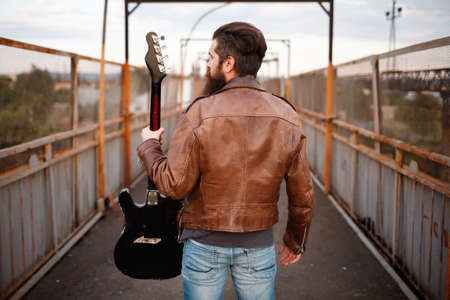 Angry male musician with gray hair in a brown leather jacket and blue jeans swings an electric guitar and shouts against the background of a railway crossing